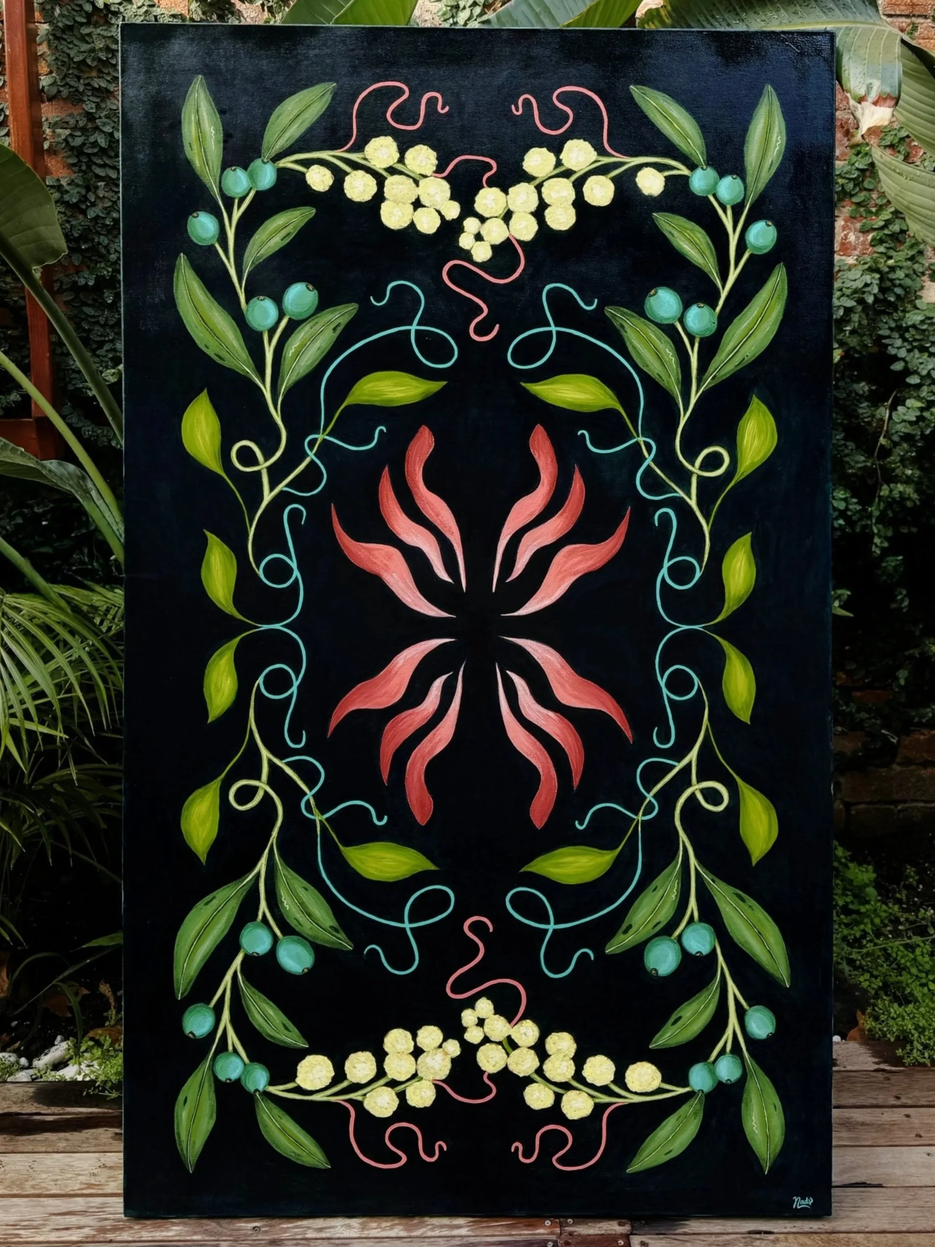 In this artwork, they weave together to form a floral mandala. A reminder that everything in nature is interconnected. The Wattle offers soft, golden blossoms and carries a sense of lightness and renewal. The Eucalyptus, with its fire-resistant bark and aromatic leaves, represents strength, survival, and grounding. Their coexistence marks the beginning of my journey in Australia, and this piece is a tribute to that connection.