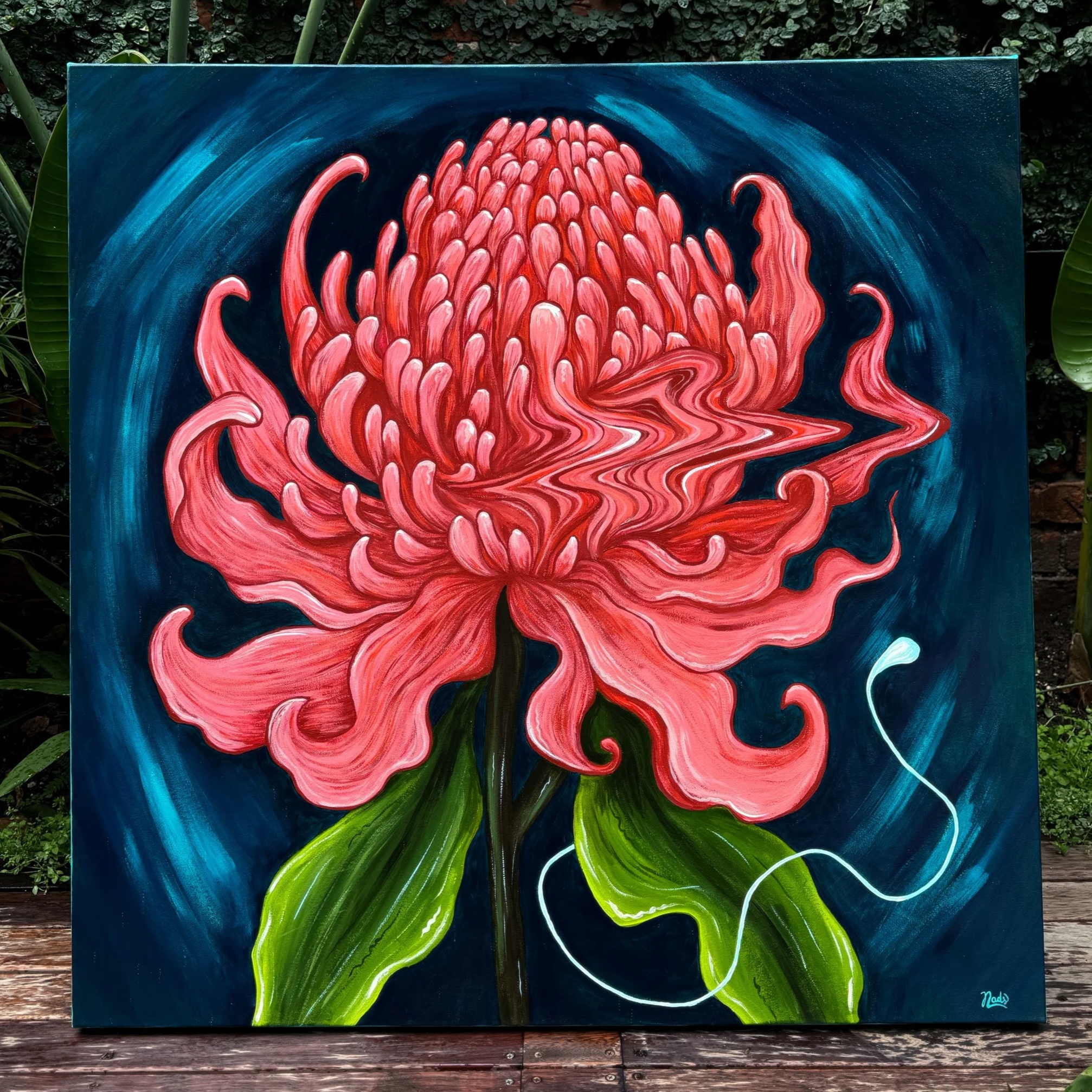 “Waratah” was the first native flower that truly stunned me. Its deep, vivid red that seemed to pulse with life was impossible to ignore. As I painted it, I felt a powerful connection to its essence: resilience. The Waratah survives and regenerates after fire, thanks to its lignotuber, a woody swelling, that rests beneath the soil. A quiet strength buried deep. To the Aboriginal peoples, it symbolises courage, healing and renewal. In many ways, it became a reflection of my own journey: beauty that rises after difficulty, blooming again, brighter.